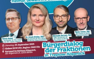 📆 Einladung zum Bürgerdialog in Treptow-Köpenick Dienstag, 23. September 2025 Einlass: 18:30 Uhr 🚪 Beginn: 19:00 Uhr 🎤 Ratssaal im Rathaus Köpenick, Alt-Köpenick 21, 12555 🏛️ "Heimat bewahren - Zukunft gestalten!" Unter diesem Motto stellen sich die AfD-Hauptstadtfraktion und die BVV-Fraktion in Treptow-Köpenick den Fragen der Bürger. Kommt vorbei und diskutiert mit uns!