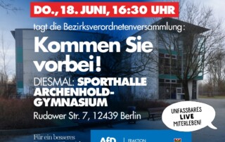 Zur letzten BVV-Sitzung vor den Sommerferien sind endlich wieder Zuschauer zugelassen. Aufgrund des Abstandsgebots findet die Sitzung allerdings in der Sporthalle des Archenhold-Gymnasiums in Niederschöneweide statt und Gäste sollen sich bitte vorher unter (030) 90297-4186 oder per E-Mail unter post.bvv@ba-tk.berlin.de anmelden. Sie können aber auch per Livestream dabei sein: https://bvv.netbroadcast.de/?fbclid=IwAR0S1-MBCuuIWBaWn7AcvpEWRwP24C18GU4xgjs8howi4Ei_dVKTO5FSVJs Diese BVV hat wieder einiges [...]